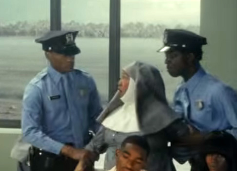 As soon as the knight leaves the frame (we later see him sitting on a pew), a modern type of cavalry enters: Police officers.