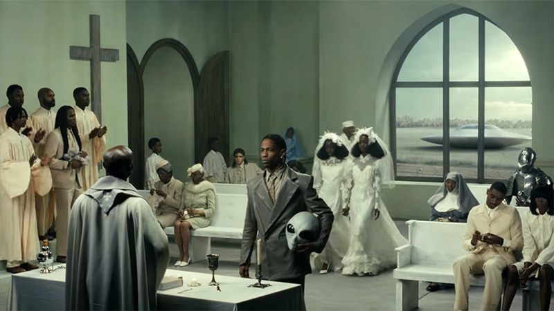 In many ways, Father is very Kanye West. It appears to be Christian while constantly contradicting it, and it appears to criticize the industry even as both Kanye and Travis Scott are deep in it. Furthermore, the video blatantly tells us that we’re not truly looking at Kanye and Travis, but at masks to fit in … or fit out.