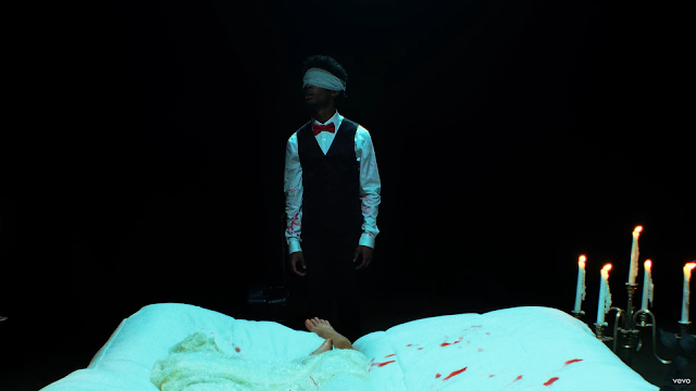 In August 2023, he released “Notes From A Wrist.” He appears to be arguing with his girlfriend in some scenes, but loving her in others. In this scene, his blindfolded and blood-stained alter ego watches him.